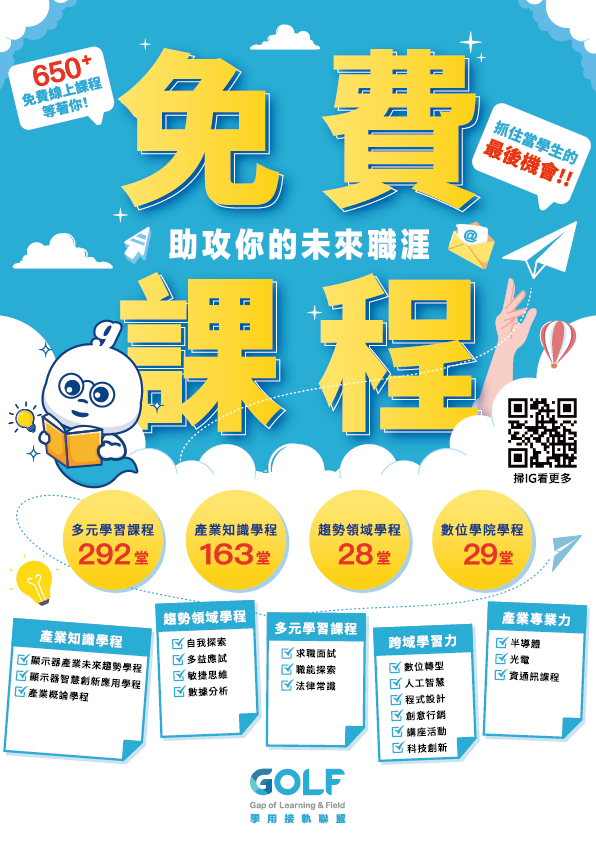 為幫助同學在進入職場前快速提升就業力,GOLF 平台也同步開放超過 650+ 門免費線上課程,歡迎學生自由選修!